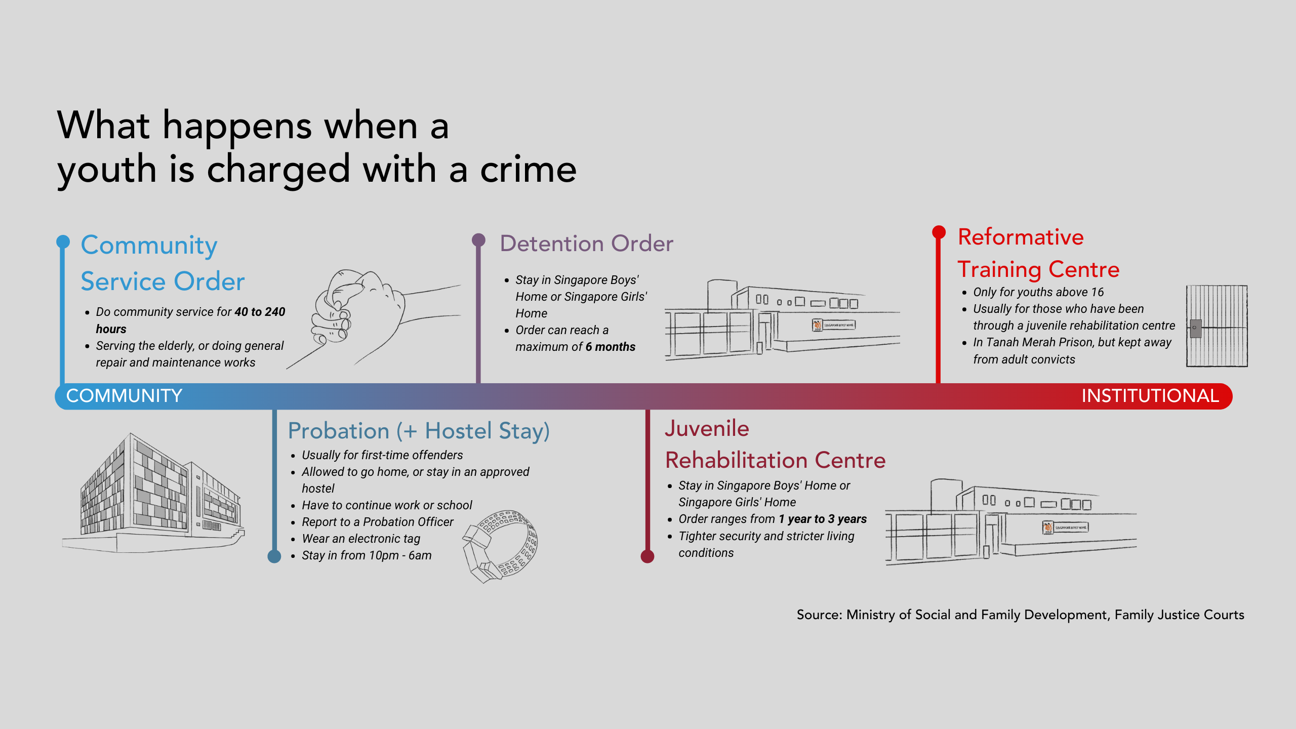 Youth offenders charged in the Youth Court can expect a variety of outcomes. As far as possible, they are first considered for probation and rehabilitation instead of residential stays in a home, said the ministry.